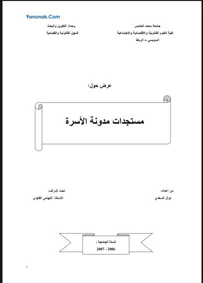 🔑 الكلمات المفتاحية: مدونة الأسرة، الزواج، الطلاق، النسب، الحضانة، الميراث، المساواة بين الزوجين.